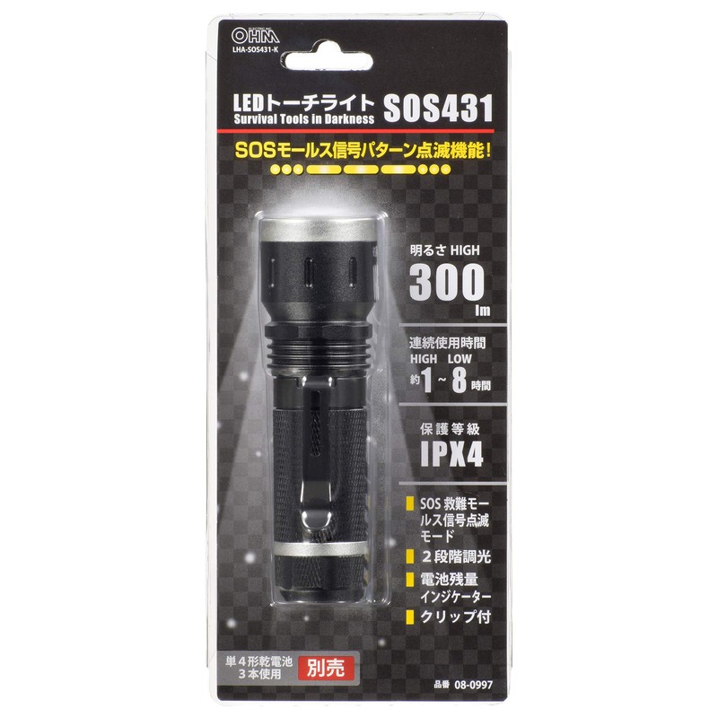 OHM LHA-SOS431-K LED Torch Light with SOS Morse Signal Flashing Function 300lm