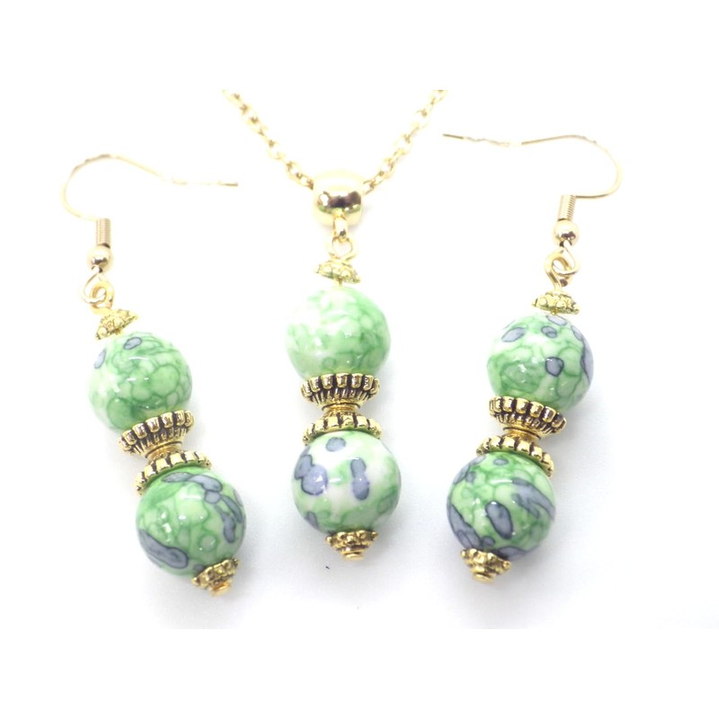 Ohrringe und Halskette aus vergoldetem Stahl, besetzt mit einem Anhänger aus grün und schwarz getönten weißen Jadeperlen und tibetischen Perlen