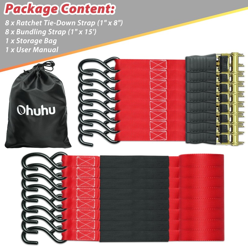 Ohuhu Ratchet Tie Down Straps 16-Pack (8-Pack Orange + 8-Pack Red)