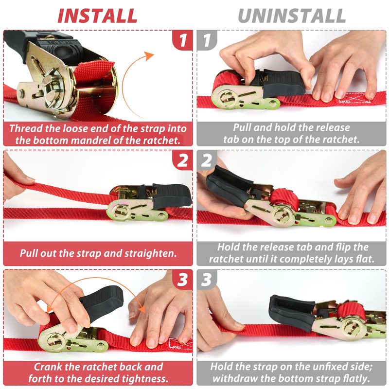 • Easy to Maneuver: Thanks to the release lever and ratchet locks, it won't take a long time to get your head around this ratchet tie-down strap. With simple operation. You can secure the cargo in place and hit the road in no time! Once you've done transporting, use the included storage bag to stash the tie-down strap away for easy organization.