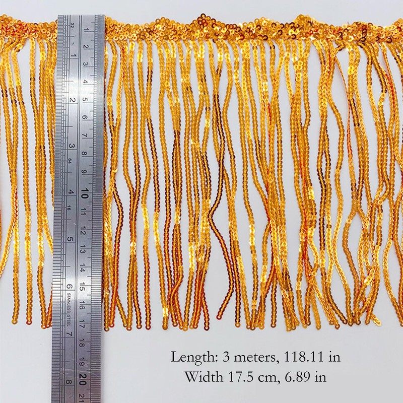 OHYER 3 Metres Long (x 17.5 cm Wide) Wide Fringe Trim Tassel Silk Sequins DIY Hem Dress Garment Fringe Skirt Cut Fringe Ribbon Decorative Border Sequins Fringe Trim (Gold)