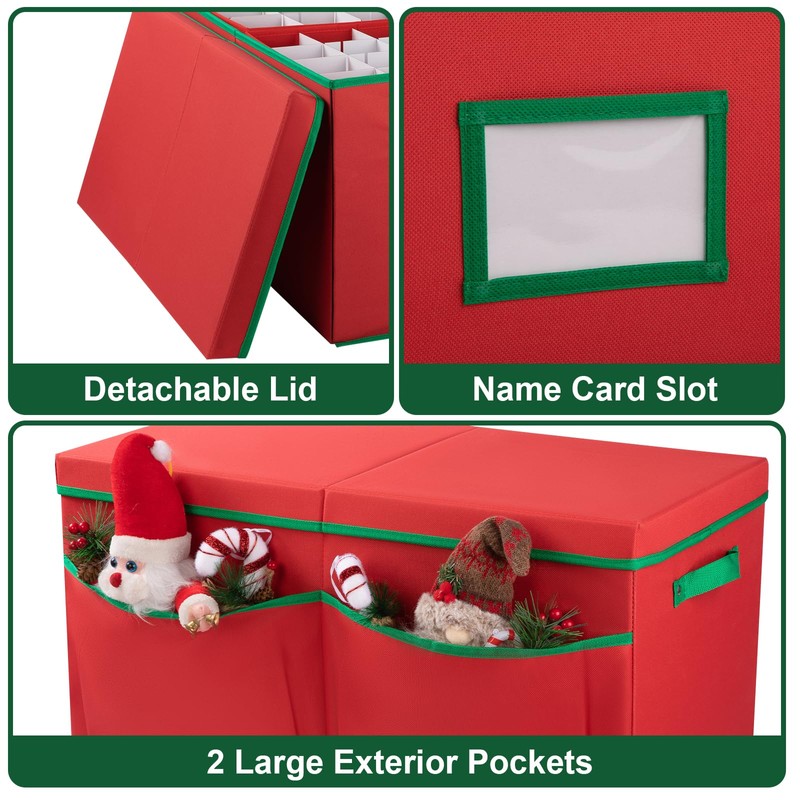 - Large size: The ornament storage can easily accommodate up to 128 3-inch Christmas balls. Its unique adjustable partition design allows you to flexibly adjust to different sizes of decorative balls, ensuring that each ornament is perfectly fitted and protected. Ornament storage box has two large pockets outside for storing other Christmas items