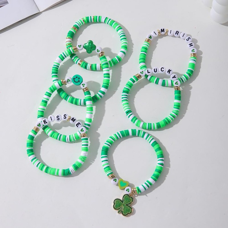 OIDIMS Clover Irish Festival Bracelet Charm Green Shamrock Heishi Clay Bead Bracelet Set St.Patrick’s Day Bracelets for Women Men Stretch Bracelet Lucky Statement Gift Xmas Promise 7pcs