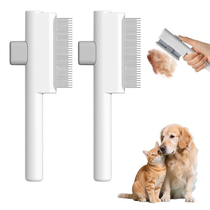 Oiieco 2Pcs Cat Comb Dog Combs Set, Pet Hair Remover Comb Flea Cat Grooming Brush with Release Button for Shedding Tangles & Removal Loose Fur, White