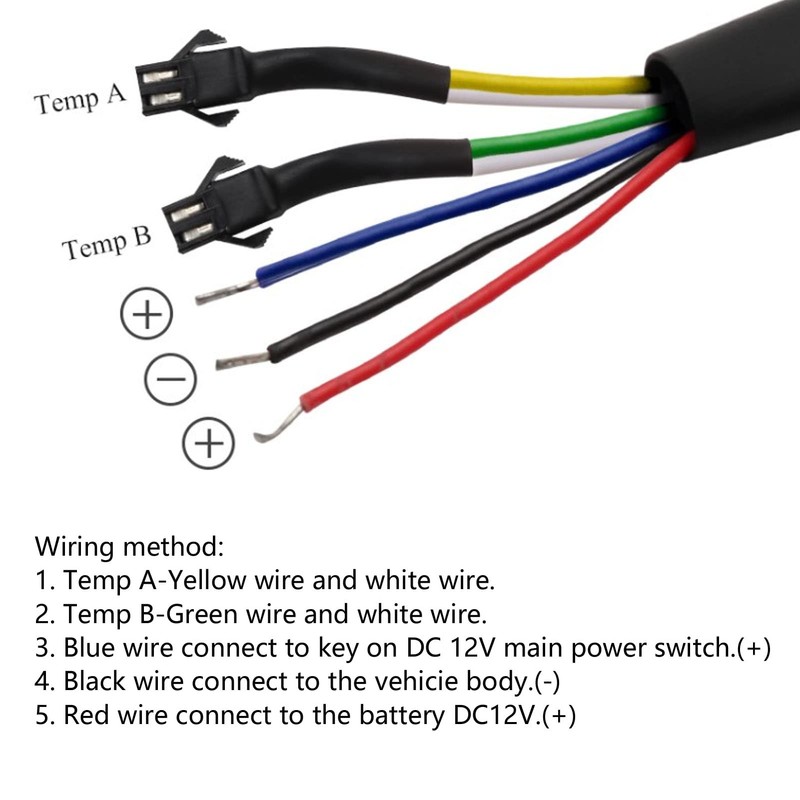 Wiring method: 1. Temperature AYelber wire and white wire.2. Temp BGreen cable and white cable.3. Connect blue cable to the button on the DC 12V main switch.(+)4. Black cable to connect to the vehicle body.()5. Red cable for connecting to the battery DC12V.(+)6. Water Temperature: The tee must be connected to the cooling water pipe, and then the sensor is connected to the tee7. Oil temperature: attach the oil temperature screw to the oil outlet, and then connect the sensor to the screw
