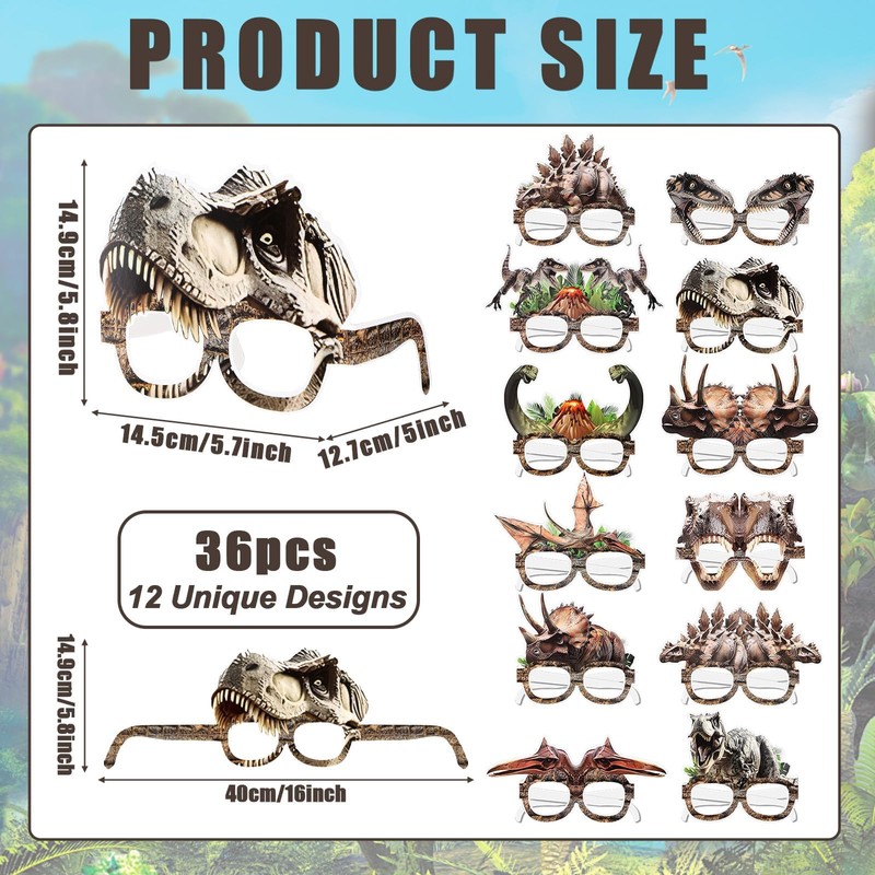 - Suitable Size: The Dino themed paper glasses are about 5.74 inch in length, suitable for both kids and adults to wear. The Jungle Animal Photo Props are designed to be foldable, convenient for carrying in bags, storing in drawers, and adapting to different dinosaur party decorations.