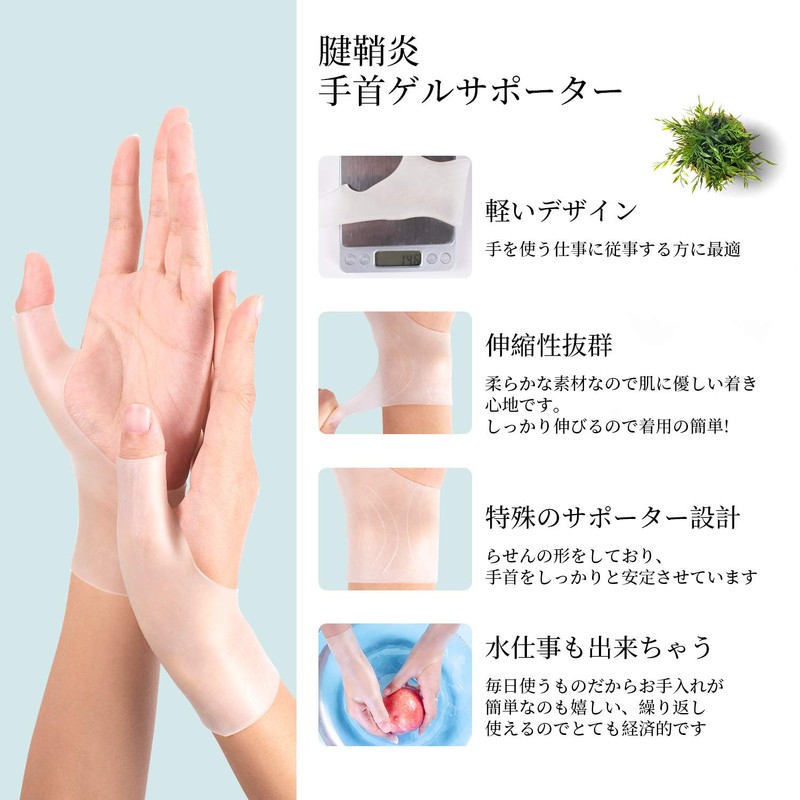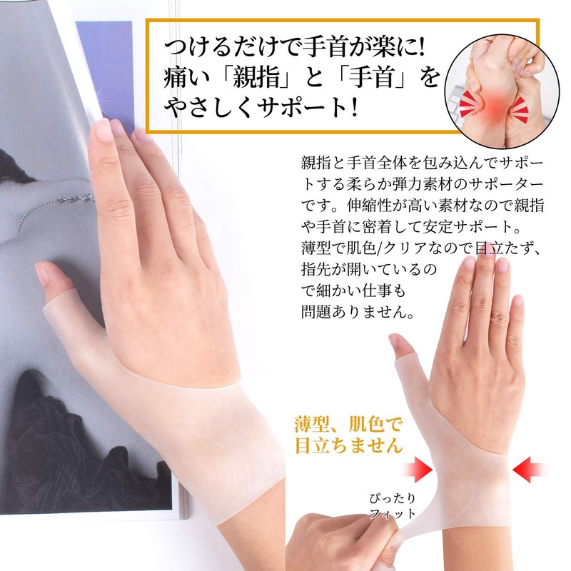- 【独特な設計】つけるだけで手首が楽に!伸縮性にすぐれているので手の形状にピッタリフィットする手首サポーターです。薄型でベージュや半透明なので目立たず、指先が開いているので細かい仕事も問題ありません。
