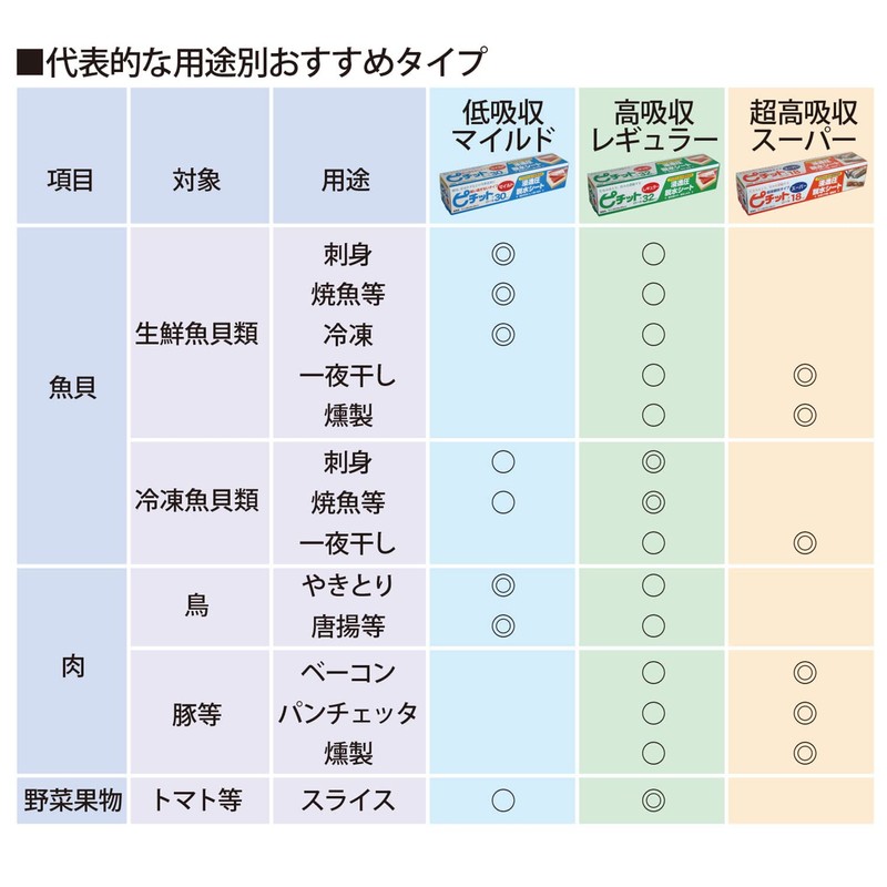 - Examples of using Pichitto: This material allows you to see the effects of "Pititto". The material is not too suitable for "pit" "Pititto" removes moisture and odor, making it easy to delicious a variety of ingredients. However, it is also a fact that depending on the material, the orientation and unsuitable is not suitable. Please use the following reference. Material that allows you to see the effects of "pitit" (material that is not too suitable for "pititit" material) It can remove the smell of bluefish and cultivated fish, so it is effective for those who don't like this smell; Example: Sardine / Sunma, etc.; Material that has a lot of fat and water - it is difficult to understand the effect of "pit" after a long time, it will disappears. Material Example: Frost Materials such as flesh / tuna totoro with watery and odors. -Removes moisture and odor and condenses flavor while suppressing dripping. -Example: Chicken peach meat. -Naturally low-moisture material. -Can remove raw odor. -Examples may give a feeling of stickiness to the material. -Example: Chicken sheath/chicken crumbers. Reduces drip Condenses flavor: Material examples: Frozen scallops, etc., Pre-tightened with salt → Pre-seasoned with salt, so there is no need to remove moisture. Material example: Salt salmon / several pots and other materials such as Pitit