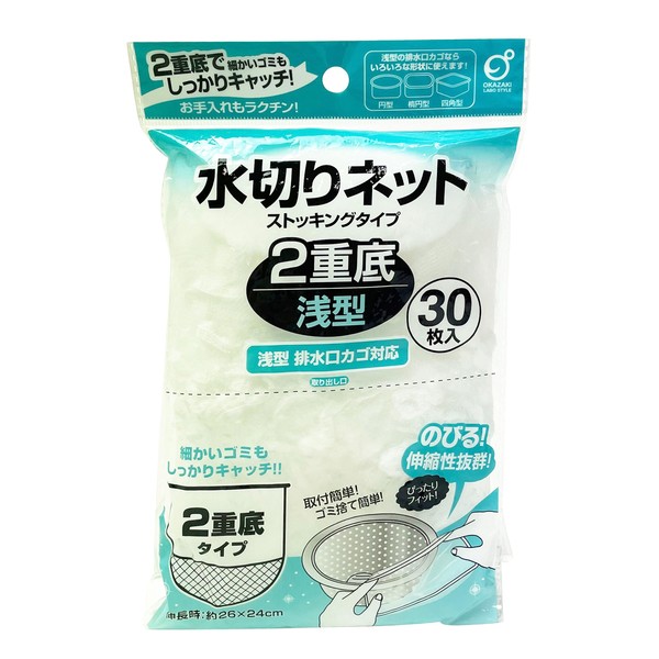 Okazaki Drainage Net, Double Bottom, Stocking Type, Drain Basin, Shallow Type, Approx. Length 10.2 x Width 9.4 inches (26 x 24 cm) (Extended), Pack of 30