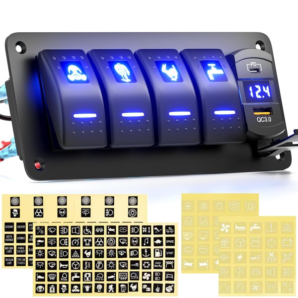 Okerny - Panel de interruptor basculante de 4 pandillas+ PD de carga rápida + 3.0 USB + voltímetro precableado panel de aluminio interruptores de palanca para automóvil, automóvil, barco, RV, ATV,