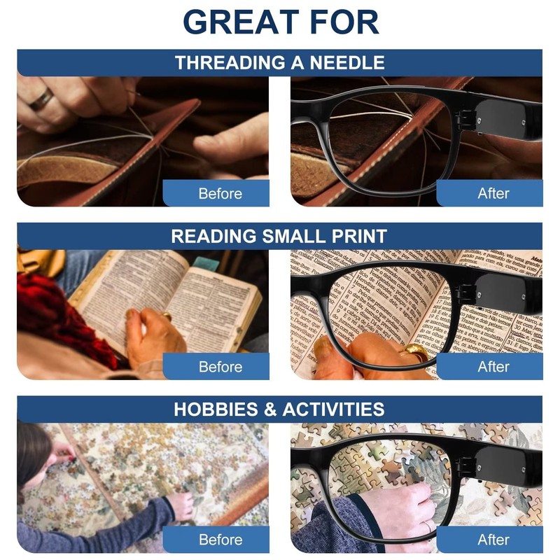 - 【 Lighted Reading Glasses 】OKH reading magnification glasses with bright LED light on each side, which can magnify your object detail and light it up, good for night /day reading and detail work such as embroidery, diamond painting, model building, soldering, sewing, craft, hobby, knitting, cross stitch, jewelry work, watch repair and etc.