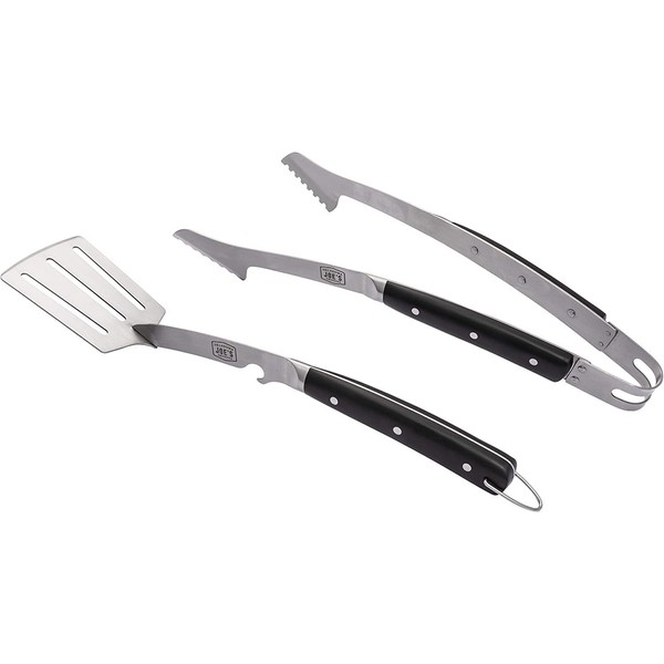 The Oklahoma Joe’s Blacksmith 2-Piece Toolset enhances your cooking experience with superior quality and functionality. Includes heavy-duty tongs and spatula. Features full-tang riveted handle construction for increased stability and a vertical neck design for superior strength. The end result is tools which are durable in nature and easy-to-use. Spatula features a no-bend guarantee. and riveted handles, these tools are durable in nature and easy-to- use. Plus, the spatula features a no-bend guarantee and integrated notch for hanging or to use as a bottle opener.