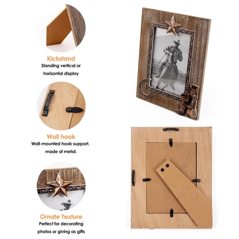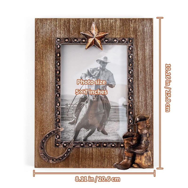 • PERFECT SIZE FOR DECOR: Our farmhouse cowboy picture frame is perfect for 5 x 7 photo & image, we are good for standing desktop or wall mounting display, and we have 1 sawtooth hook for this 5 X 7 wood frame great to show your pictures vertically.