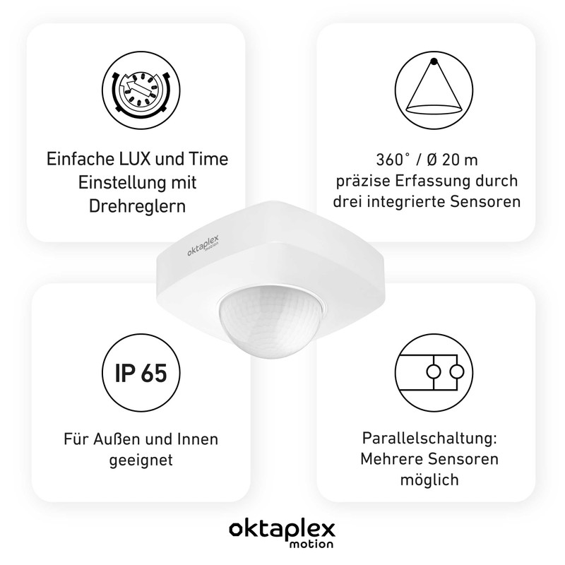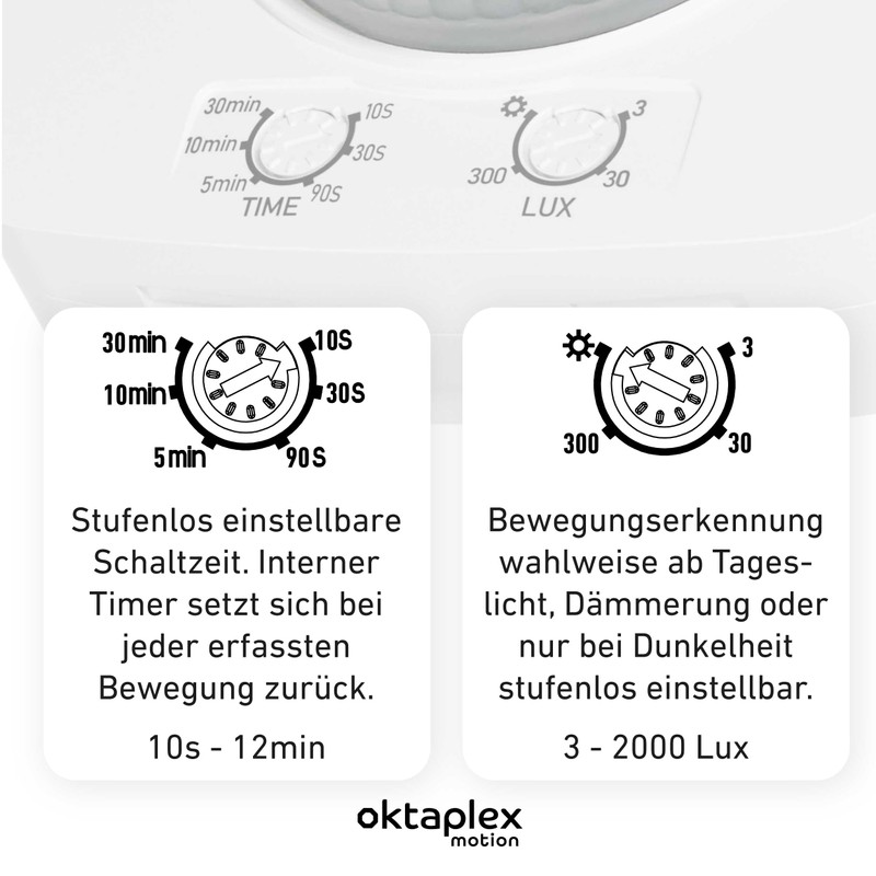 Oktaplex Tim Presence Detector 360° Motion Sensor Outdoor IP65 PIR Motion Sensor White 230 V Surface-Mounted