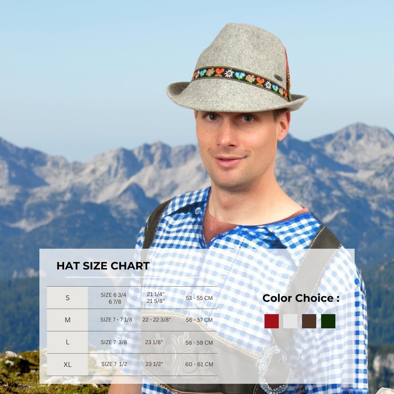 - 100% Wool Alpine Hat: This wool hat is a must-have Oktoberfest accessory. Styled as an alpine hat or tyrolean hat, it’s made from 100% wool felt, offering premium quality. A top pick among fedora hats for men, this piece is perfect for Oktoberfest hats for women, oktoberfest hat men, and lederhosen hat men costumes.