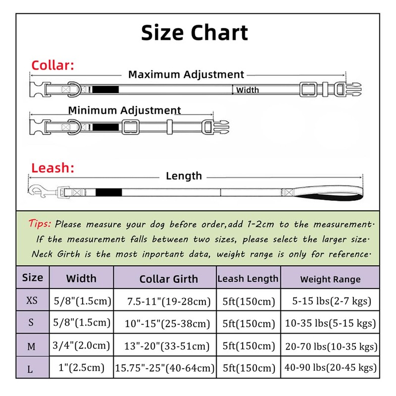 Large Size: Collar:Width 1"* Adjustable Girth 15.5"-25",Leash:Width 1"*Length 5ft.