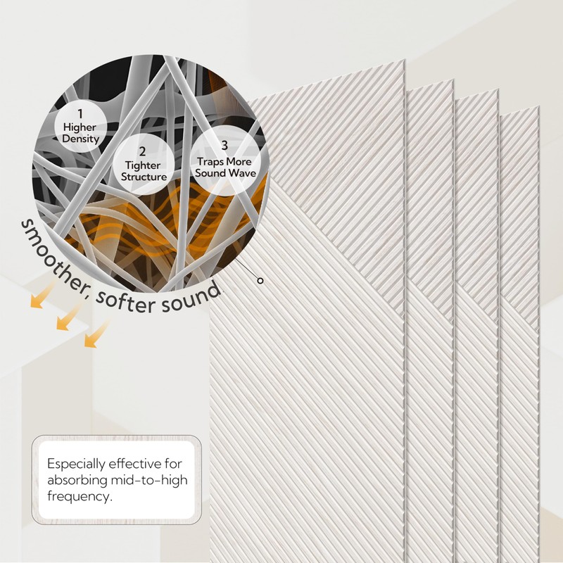 • Easy Peel-and-Stick SetupNo Tools Required: Each pack includes strong adhesive backing, so these sound panels are used for quick DIY installation. Just peel, stick, and arrange to cover walls, doors, or ceilings, fully customizable. A soft, light finish with subtle diagonal and horizontal grooves for a minimalist, modern appearance. Great for bright, airy spaces while enhancing sound absorption.