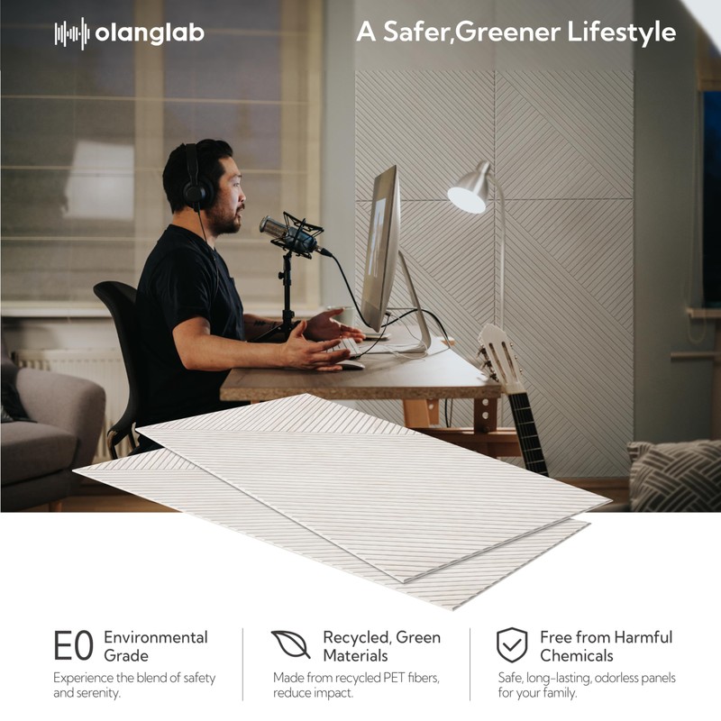 • Recycled & Reliable Material: Made from 100% recycled polyester fiber, these sound dampening panels are odorless and safe for family use. Safe for children, pets, and adults, they are capable of long-term indoor use without warping or losing performance. Olanglab's acoustic panels for interior wall decor significantly cut down on noise and echoes.