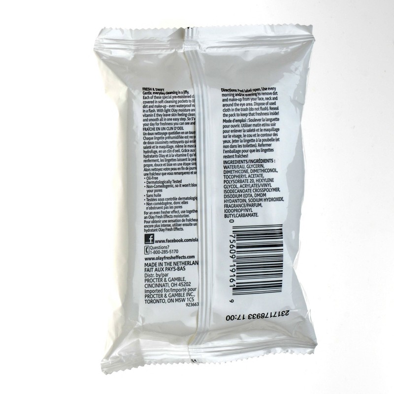 Youre busy, we get it. So, check out a refreshing clean that keeps up with you Olay Fresh Effects S'Wipe Out refreshing make-up removal cloths. Now you can keep everyday cleansing at your fingertips to lift away dirt and make-up in a flash even waterproof mascara!Conveniently packaged in a packet of 20 and perfect for on-the-go, these handy make-up remover wipes belong in your purse, your gym bag, your carry-on everywhere you go. Then, whenever you need a quick clean with a refreshing kick, its there to do the dirty work. With Olay Fresh Effects make-up remover wipes, you're good to go.Each SWipe Out pre-moistened cloth is covered in cottony-soft cleansing pockets and contains light Olay moisture and vitamin E. It leaves your skin feeling clean, soft and smooth all in one easy step. Get freshness you can see and feel any time, any place. Simply swipe away the day with Olay Fresh Effects S'Wipe Out refreshing make- up removal cloths.
