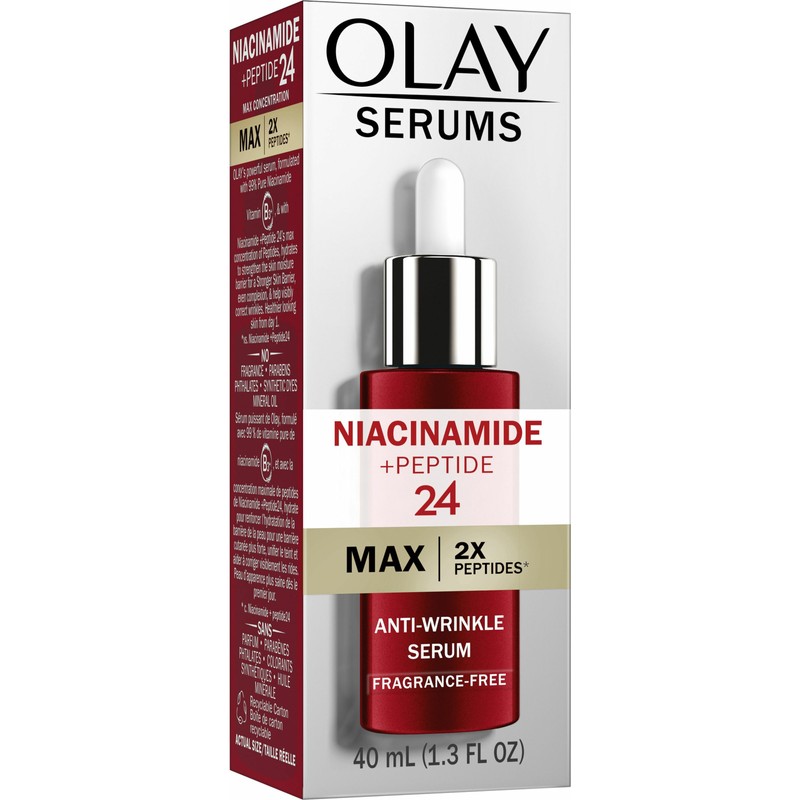 It's smooth sailing from here with OLAY's Regenerist MAX Wrinkle Serum with 2x the peptides*. This lightweight serum penetrates the surface of your skin to visibly reduce wrinkles and smooth the surface of your skin. Crafted with our max concentration of Skin-Energizing Complex with Vitamin B3+, this non-greasy formula absorbs quickly. Apply a generous amount in an even layer to your face day and night before your moisturizer, and experience visibly firm and vibrant skin. Made without fragrance, parabens, phthalates, mineral oil, or synthetic dyes. *vs. OLAY Wrinkle Correction Serum.
