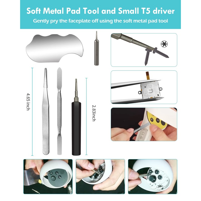 - T5 Screwdriver, Tweezer, Pry ToolThe kit is equipped with a T5 screwdriver and a small T5 screwdriver, switch at any time according to your needs. Comfortable and easy to open the oculus controller without much force. In addition, we also provide Tweezer, Pry Tool. (Note:Professional replacement is highly recommended)