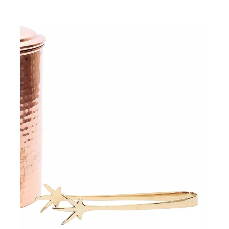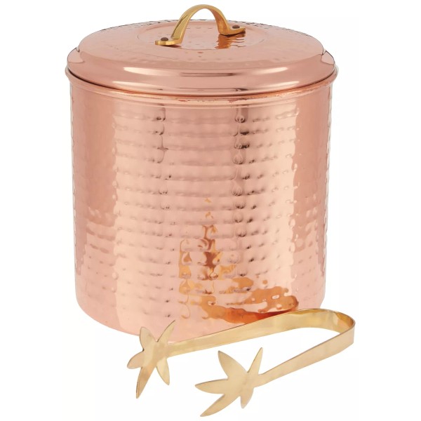 Our copper-plated ice bucket's simple, classic design will add a touch of class to any bar. Dressed to impress with its hand-hammered finish, its 3 qt. Capacity keeps plenty of ice on hand, while the removable liner with draining plate keeps your ice cold and dry. Exterior is coated with a Lacquered finish for tarnish resistance. you do not need to remove lacquer in order to use this ice bucket. ice bucket dimensions: 7 x 7 x 8.25 hand wash only with a damp cloth. A mild dish detergent solution may be used for cleaning. After washing, hand dry thoroughly. do not soak in water. Not dish washer safe.