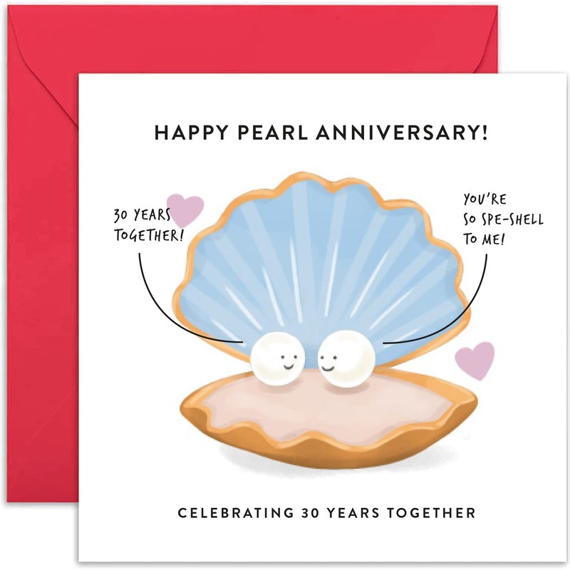 - ❤️ FUNNY ANNIVERSARY CARD: The perfect greeting card to gift your wife, husband, family, or friends celebrating their 30th pearl wedding anniversary. Make them laugh and smile with this funny illustrated greeting card showing a couple of pearls in a clam shell as romantic married couple.