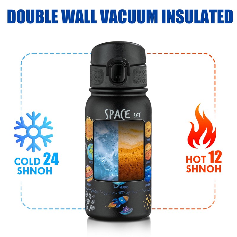 - Insulated Water Bottle:Our insulated stainless steel water bottle designed for kids, keeps liquids hot for 12 hours and cold for 24 hours. Our insulated water bottle using 304 stainless steel, free of BPA, lead, PAES