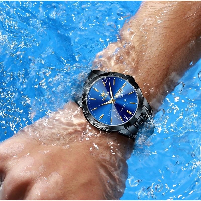 OLEVS Blue Black Watches for Men Waterproof Diamond Business Luxury Dress Analog Quartz Stainless Steel Luminous Day Date Two Tone Casual Men's Wrist Watches Gift