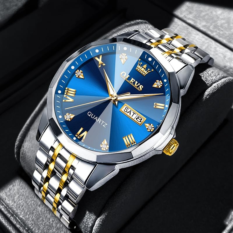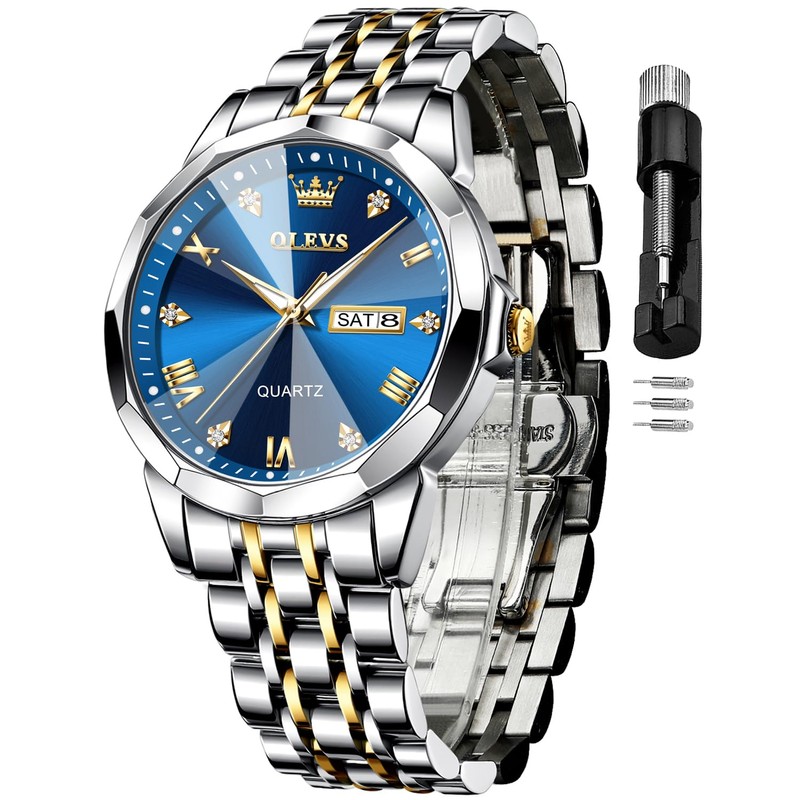 OLEVS Reloj para Hombres Diamante Lujo Negocios Analógico Cuarzo Impermeable Luminoso Azul Vestido Relojes Calendario Negocios Acero Inoxidable Reloj de Pulsera de Dos Tonos