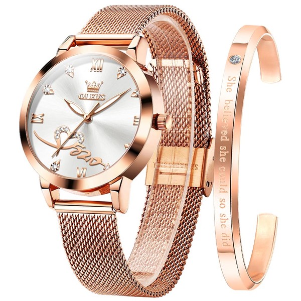 OLEVS Women's Watch Rose Gold with Heart Diamond Black White Face Quartz Wrist Watch Waterproof Belt Bangle Set, Roségold/white, Bracelet