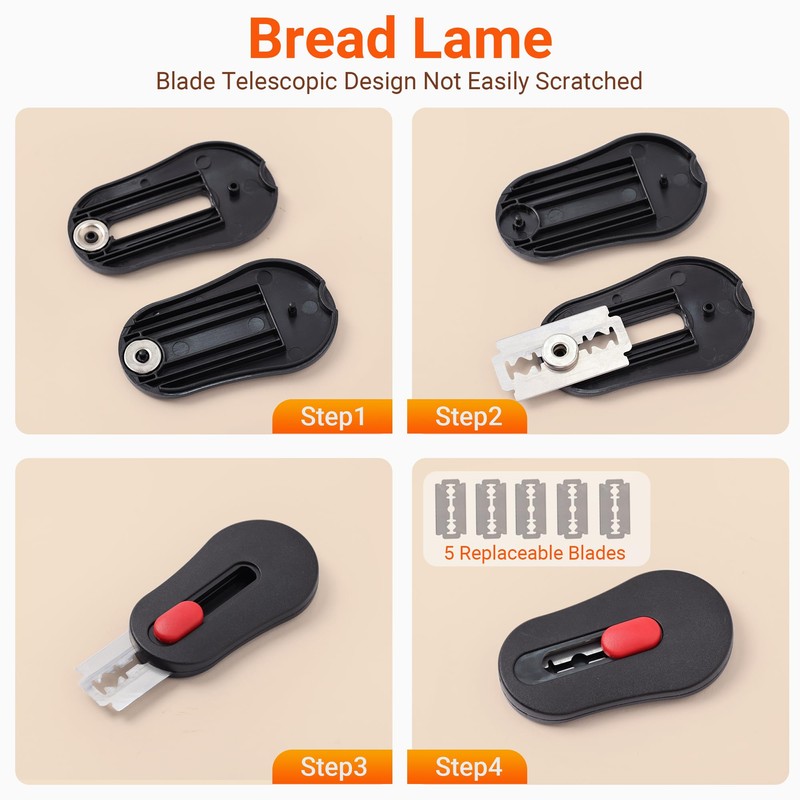 telescopic bread lame with 5 blades,1x dough whisk,1x stainless steel scraper,1x cleaning brush, 1x bowl scraper, ensuring you has everything you need for enjoyable baking!