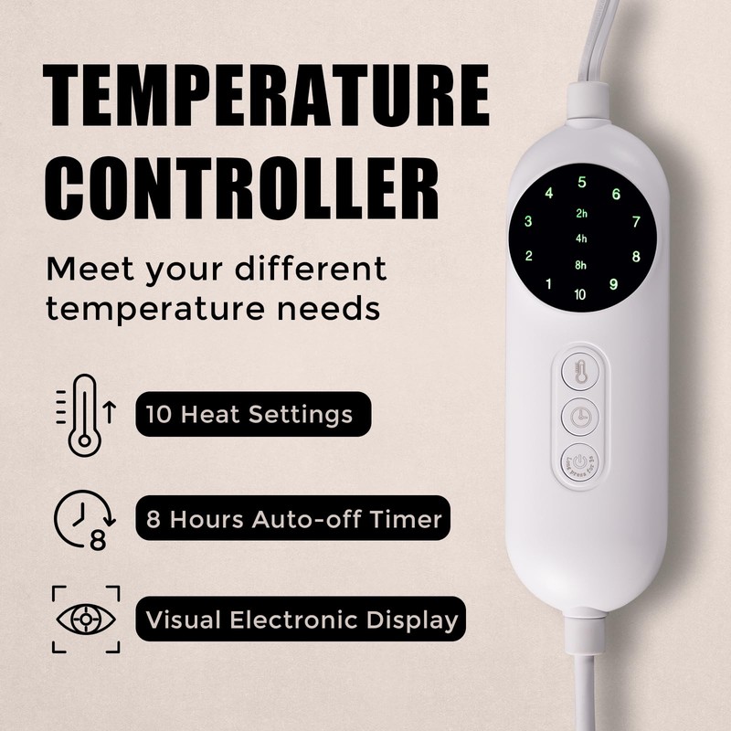 - Easy Operation: Featuring fast and consistent heating, this electric throw blanket offers 10 heating levels and 2/4/8 hours time-settings for customizable coziness, warm and relax your body, and relieve fatigue.Powered by advanced heating wire technology, it can precisely control temperature, ensuring safer warmth