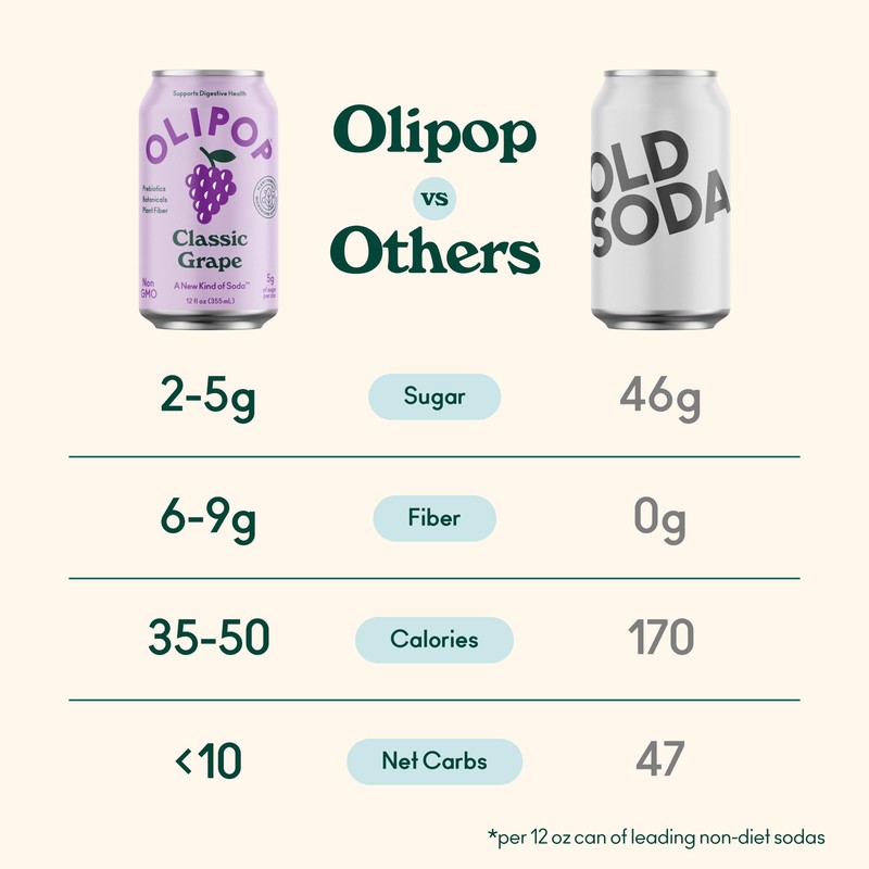 - FRUITY FRESHNESS: Get 12 cans of Olipop Classic Grape, a satisfying blend of traditional taste with gut-friendly ingredients. Store in a cool, dry place. See packaging for details or reach out to our customer support for more information.