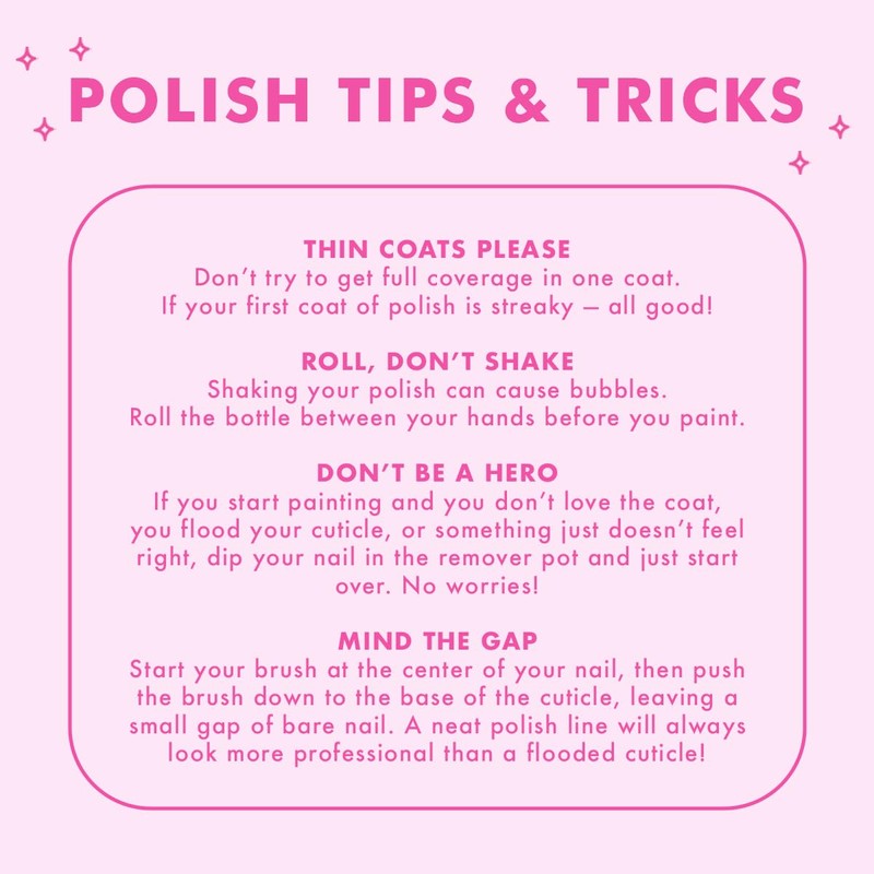 - HOW TO USE – Apply a thin coat of polish to prepped nails, aiming for complete coverage in 2-3 strokes. Let dry for 5-10 minutes and follow with a second coat if desired. For best results, follow with Long-Lasting Top Coat. Use Poppy (our patented universal polish bottle handle) to make painting neater and easier.