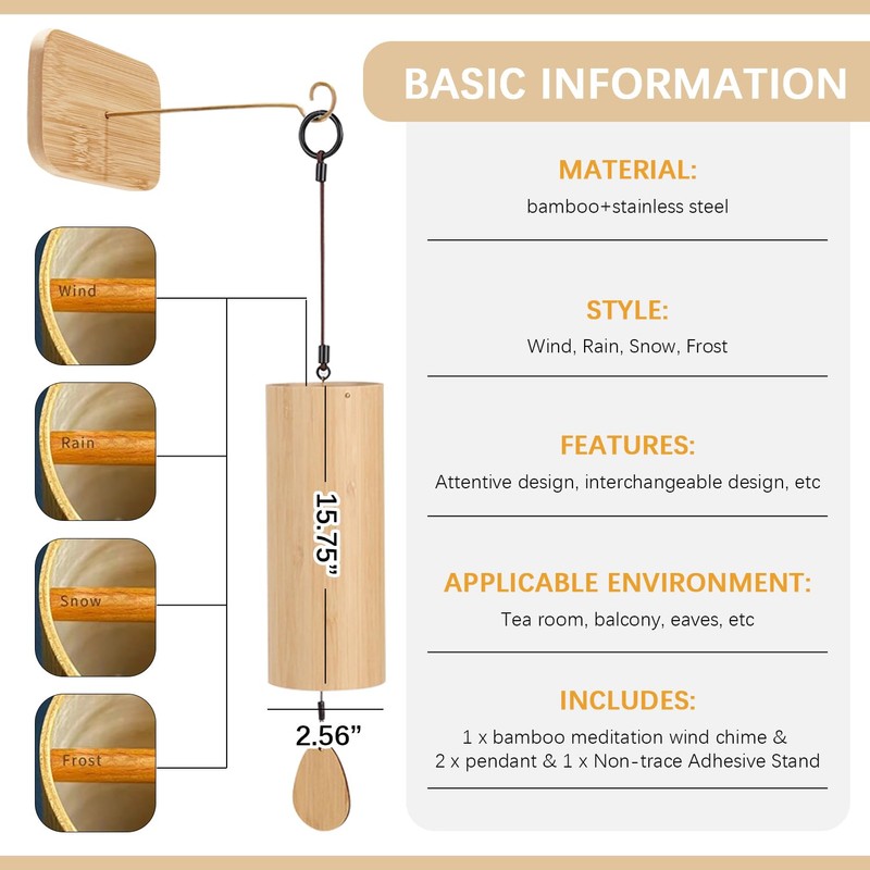 - PACKAGE INCLUDED: 1 x bamboo wind chime & 2 x pendant & 1 x Non-trace Adhesive Stand (other decorative items shown in pictures are NOT included)