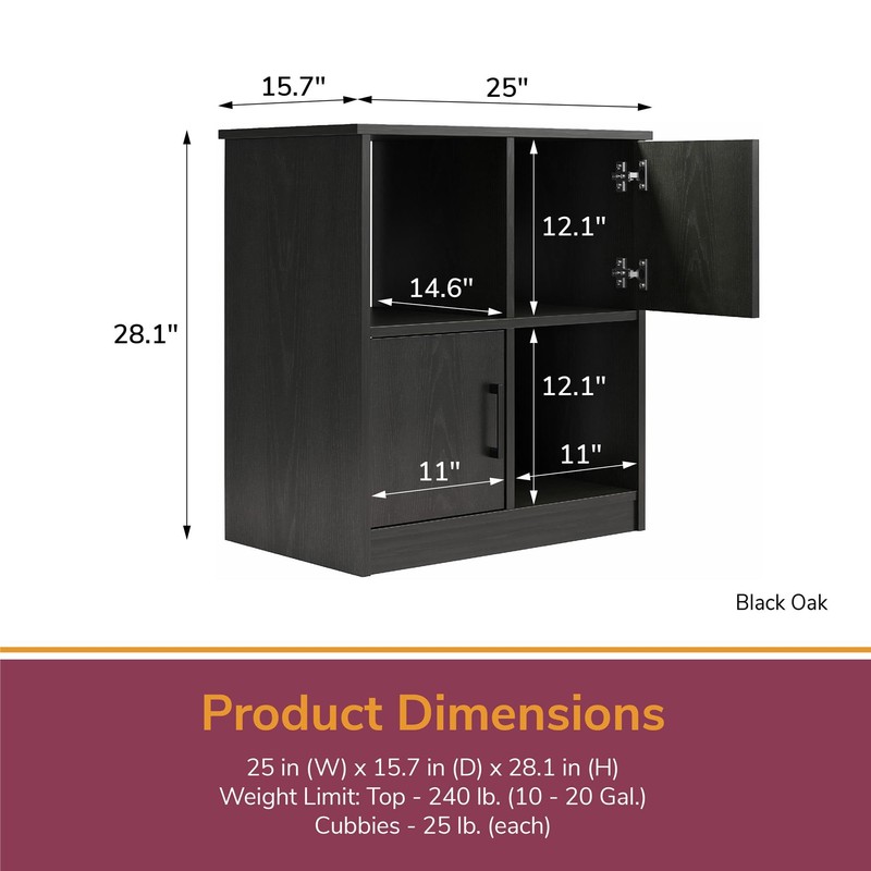 - SHIPPING & DIMENSIONS: The stand ships in one box and requires assembly. Two adults are recommended to assemble. Assembled measurements: 28.07" H x 25" W x 15.67" D; Top holds up to 240 lbs. and each cubby up to 25 lbs.