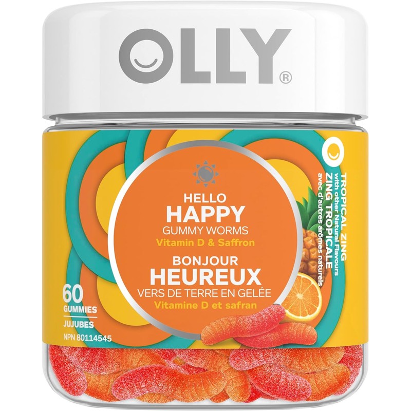- OLLY Hello Happy: This OLLY Gummy Worm Supplement Tropical Zing delivers a dose of cheer to help you feel upbeat with mood-balancing saffron and feel-good powerhouse, vitamin D*