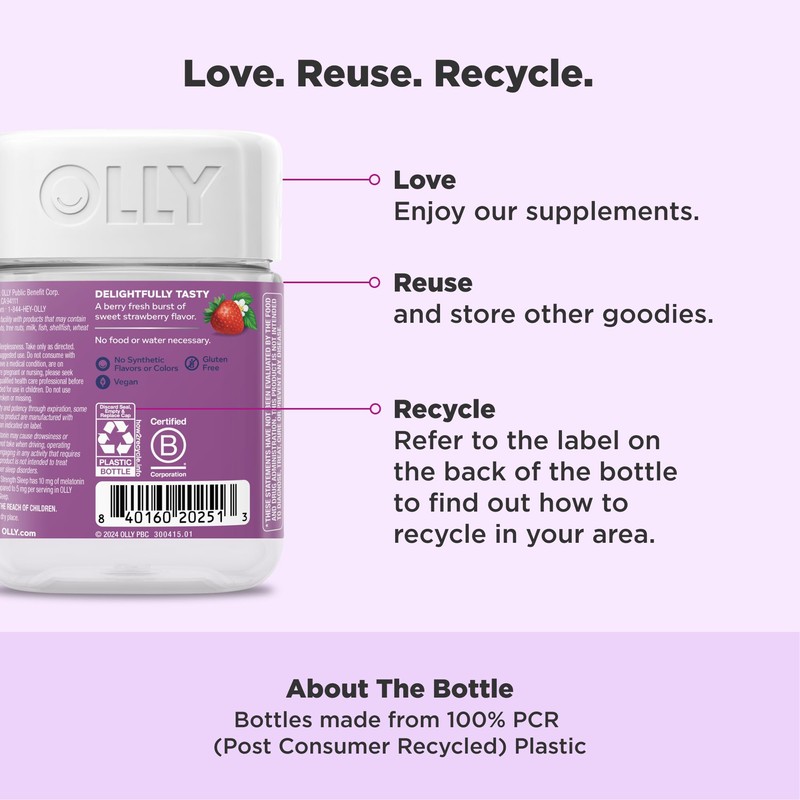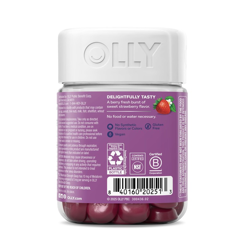 OLLY’s Maximum Strength Sleep gummies are an expert blend of sleep support, with 10 mg of Melatonin, calming L-Theanine and traditionally used botanical extracts. Just two gummies 30 minutes before bed help you fall asleep, stay asleep and wake up feeling refreshed.* These sugar-free sleep gummies for adults support a healthy sleep cycle so you can enjoy a truly restful reset—starting tonight.* Strawberry Sunset is a berry fresh burst of strawberry flavor. Gluten free and made with no synthetic colors or flavors. OLLY is a global supplement brand and B-Corp on a mission to make personal wellness accessible, delightful and wildly simple. With whole person health engrained in our brand ethos, we believe that if you’re feeling healthy and supported, you can feel empowered to be your true self. Because wellness starts with realness. *These statements have not been evaluated by the Food and Drug Administration. This product is not intended to diagnose, treat, cure or prevent any disease.