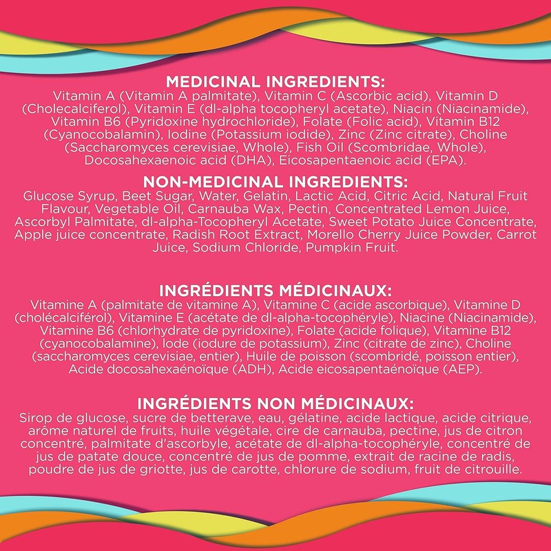 - The Goods Inside: These multivitamin gummies contain Omega-3 Fatty Acids, and vitamins A, C, D, E, Bs, and Zinc, plus Folic Acid to help support normal early fetal development of brain & spinal cord