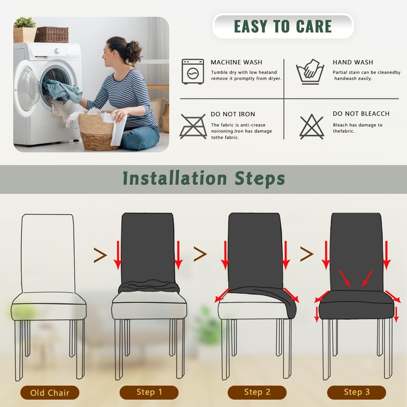 - Easy to install and wash: No complicated instructions or tools are required. Just put the dining chair cover on the dining chair and it will be done in one minute. Cold water washing can be hand washed or machine washed, tumble dried at low temperature, and cannot be ironed