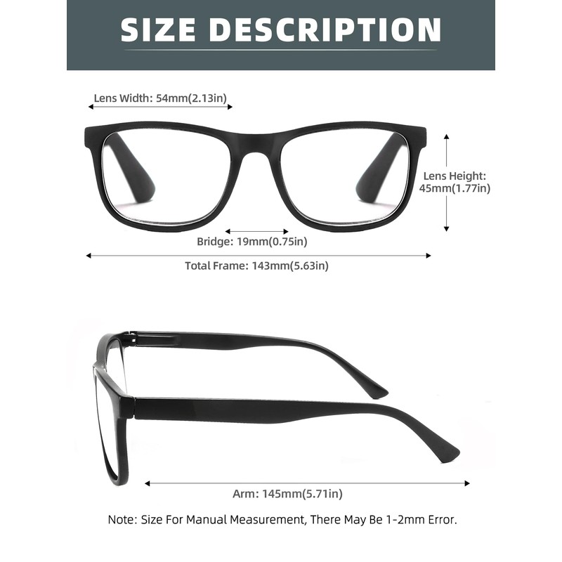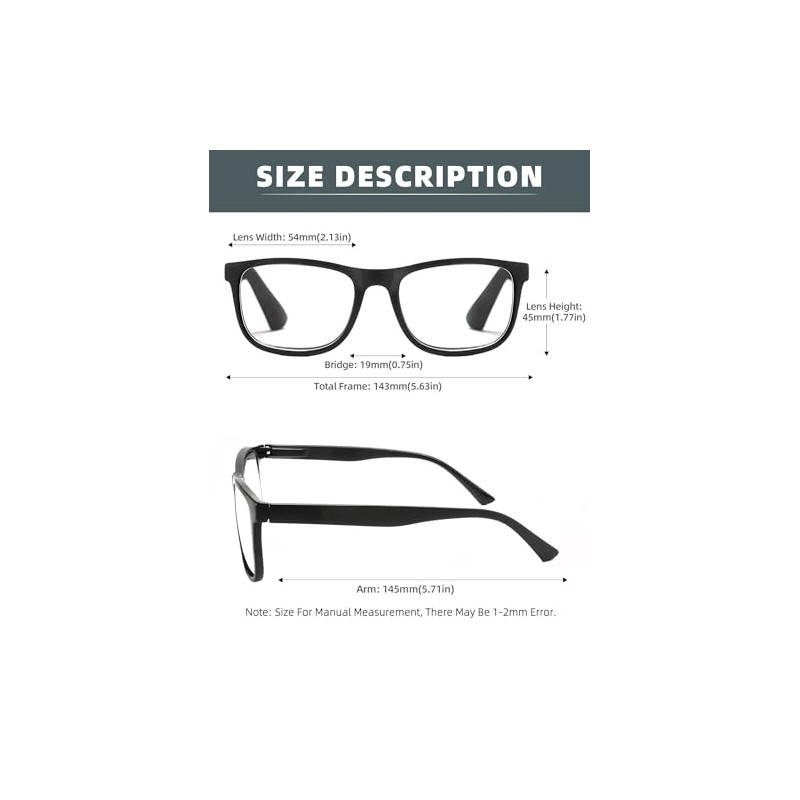 - đăProduct dimensionătotal frame width:143mm/5.63 inches; temple length:143mm/5.63 inches; lenses width:54mm/2.13 inches; lenses height:40.5mm/1.60 inches; nose bridge width:18mm/0.7 inches; please check the size before purchase; these reading glasses with wide frames are for men/male who have a big head/large face