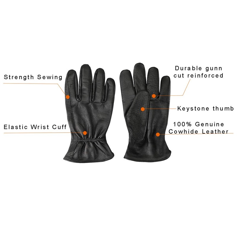 - COWHIDE LINING FOR UTILITY WORK - These gloves have a thin cotton lining that absorbs sweat and is comfortable, sweat-absorbent and comfortable.Unlike other general protective gloves, this black leather glove is cool. The cowhide contains a waterproof coating and has a certain degree of waterproof effect.