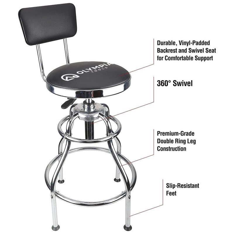 - Rotating Heavy Duty Stool: Seat rotates 360 degrees for maximum flexibility in the garage, workshop, home or office; Features rust resistant high polish chrome and premium grade double ring leg construction for durability