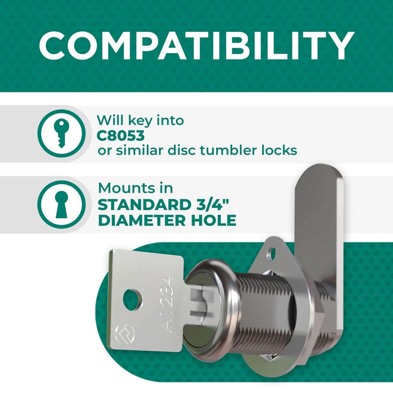 • ADAPTABLE FIT - The Cascade Series Cam Key Lock is compatible with C8053 or similar disc tumbler locks. Each 954 model tumbler cylinder lock is 15/16” " in length for fitting up to 5/8” material thickness and mounts seamlessly in a standard 3/4" diameter hole. Includes patented anti-rotation eyelet spur washer for more secure installation. The set comes with comprehensive lock accessories for instant setup. Additional cylinder lengths are available, see models 953, 955, 960, and 961.