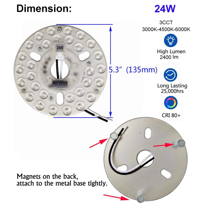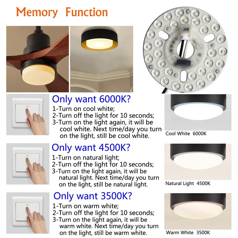 24W 5.3" LED Ceiling Fan Light Kit Replacement Board Panel with 3 Color Temperature Memory Function