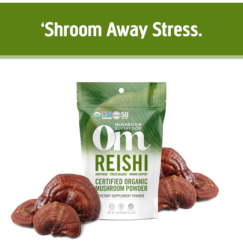 - Om Mushroom Superfood Reishi Organic Mushroom Powder: Contains one 3.5 ounce pouch (50 Servings) of whole food mushroom powder, certified organic Reishi (Ganoderma lucidum) fruit body and mycelial biomass powder cultured on organic oats