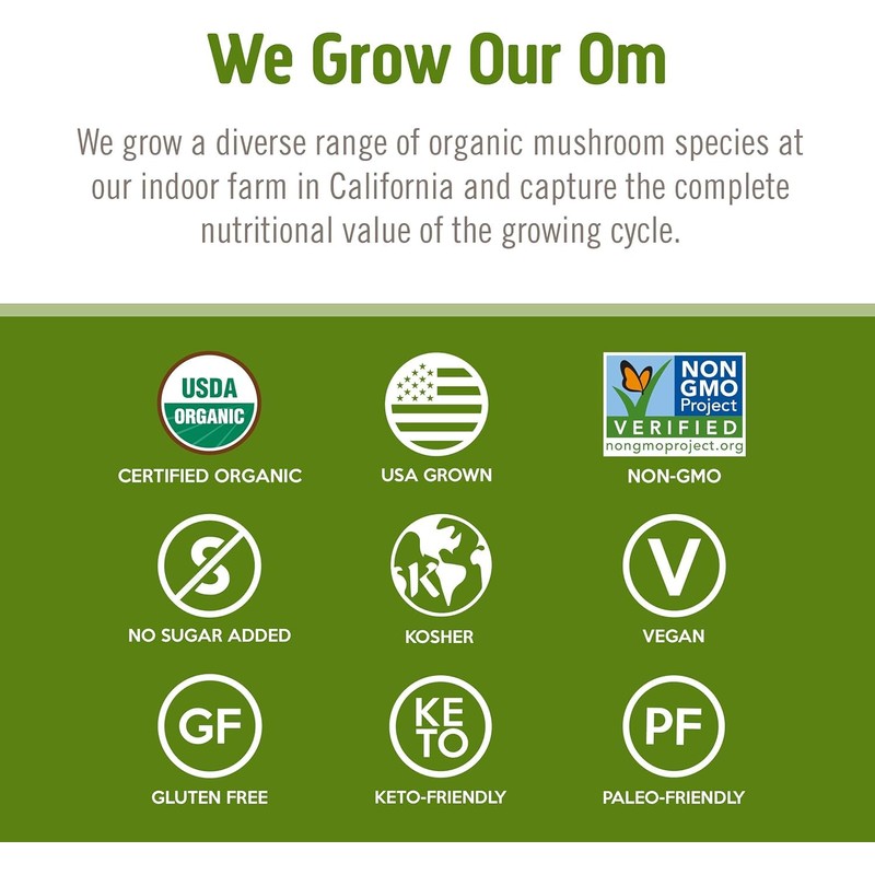 - USA Grown the Om Way: Om Mushroom Superfood Powders, Capsules, Hot Drinks, Energy Drinks and Broths are all produced in the USA. We grow, dry and mill our organic mushrooms into powders in our state of the art facilities in Southern California, to ensure the highest quality, and verify using 3rd-Party Testing. Om Mushroom powders are USDA Certified 100% organic, non-GMO, gluten-free, vegan, grown in the USA, paleo-friendly, keto-friendly, kosher