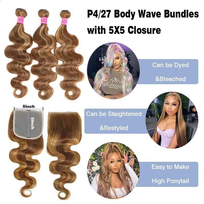 - Hair Material: 100% Unprocessed Virgin Honey Blonde Highlight Body Wave Bundles with 5x5 Closure,Cut from Young Girls Donors Directly,Can be Dyed,Staightened,Bleached or Styled as Your Own Hair