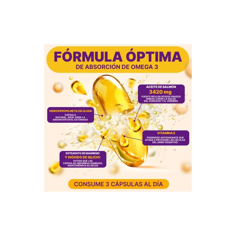 POTENCIA ÓPTIMA - Cada dosis contiene 3420 mg de Complejo de Aceite de Salmón rico en Omega 3 EPA y DHA, junto con 30 mg de Vitamina E, asegurando que recibas la potencia óptima para obtener beneficios para la salud.